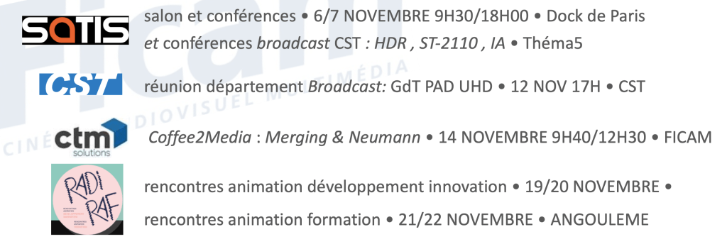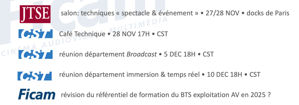 - Le département “Immersion et Temps Réel” de la CST organise une réunion de ses membres le 10 décembre prochain. Ce département prévoit de publier au printemps prochain, à l’occasion du festival de Cannes, un guide pratique consacré aux principes et applications du tournage en décors virtuel. Frédéric FERMON, responsable de ce département, est intervenu à l’occasion de la dernière réunion de la commission technique pour présenter ce projet; il souhaiterait dans ce cadre associer en tant que contributeurs des représentants de sociétés prestataires en production virtuelle membres de la FICAM. N’hésitez pas à contacter <ffermon.cst@gmail.com> pour en savoir plus sur cette initiative, si vous souhaitez participer à la rédaction des articles qui constitueront ce guide.