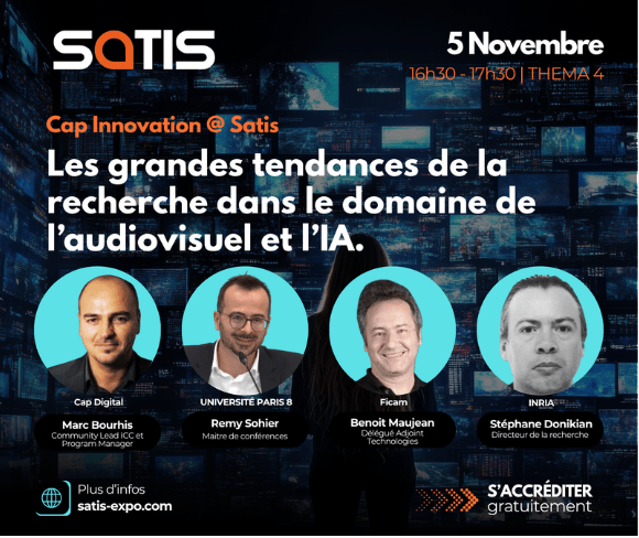 Benoît Maujean, Délégué adjoint Technologies de la FICAM, participera à la Table Ronde “Les grandes tendances de la recherche dans le domaine de l’audiovisuel et l’IA” qui se tiendra le mercredi 5 novembre de 16h30 à 17h30.