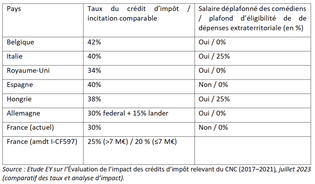 Dans le cadre du projet de loi de finances, un amendement a été adopté en commission des finances pour réduire le taux du crédit d’impôt cinéma de 30% à 25% pour les films dont le budget de production est supérieur à 7 M€ et à 20% pour les films dont le budget est inférieur à 7 M€.